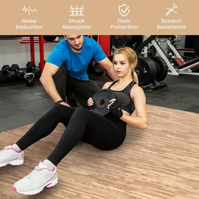 The interlocking floor mats are ideal combinations of aesthetics and practicality. They feature wood grain surface and nicely decorate room. Moreover, the high-quality floor mats bring scratch resistance to protect your floor from damage, and offer a comfortable area for exercising and playing. The interlocking floor mats are easy to be assembled and cut to fit customized area. In addition, the waterproof and easy-to-clean surface ensures simple maintenance.