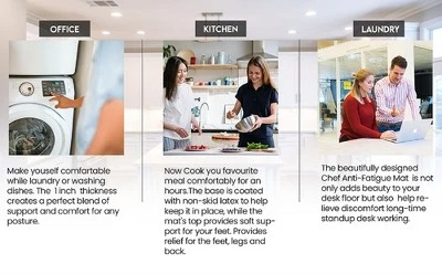 - NO SLIP: An ideal Anti- Fatigue should not only look pleasant but it should also keep the floor completely dry and prevent us from slipping. Our Nonskid backing holds the mat in place for extra safety.
